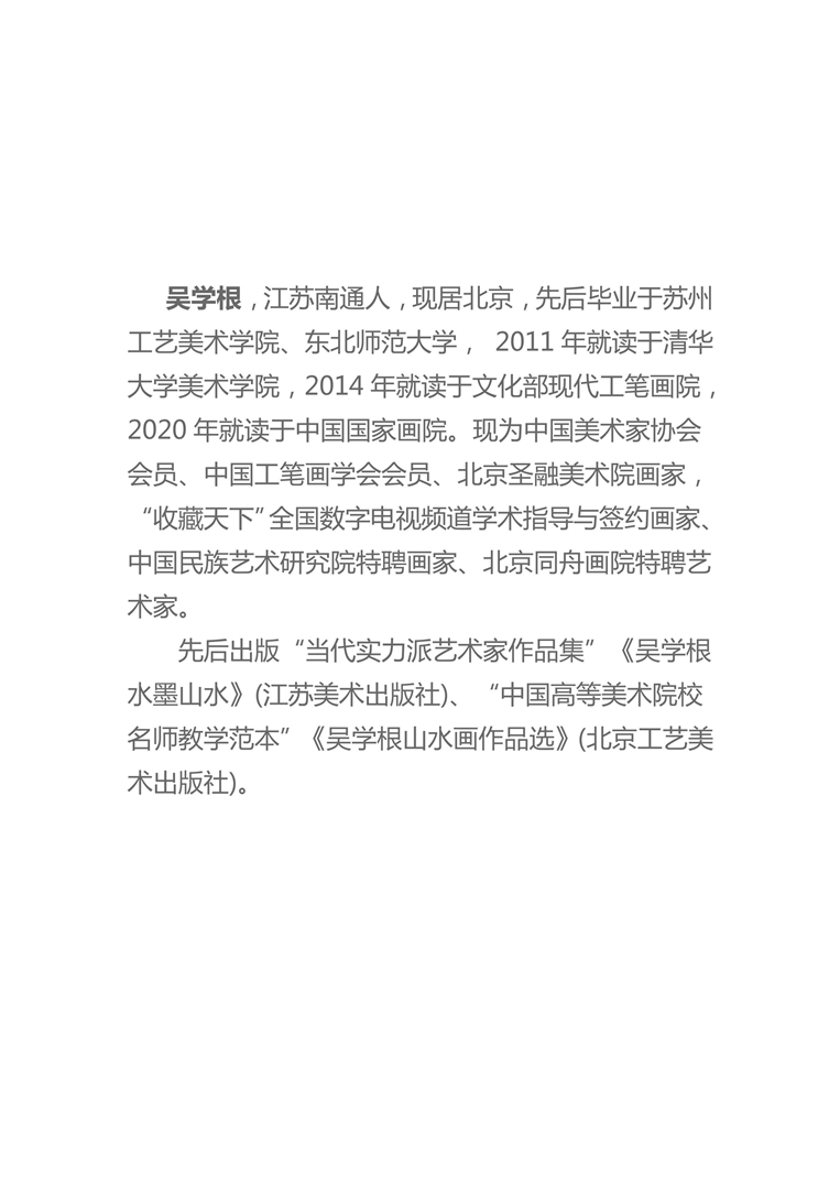 吴学根,江苏南通人,现居北京,先后毕业于苏州工艺美术学院、东北师范大学, 2011年就读于清华大学美术学院,2014年就读于文化部现代工笔画院,2020年就读于中国国家画院。现为中国美术家协会会员、中国工笔画学会会员、北京圣融美术院画家, “收藏天下”全国数字电视频道学术指导与签约画家、中国民族艺术研究院特聘画家、北京同舟画院特聘艺术家。先后出版“当代实力派艺术家作品集”《吴学根水墨山水》(江苏美术出版社)、“中国高等美术院校名师教学范本”《吴学根山水画作品选》(北京工艺美术出版社)。